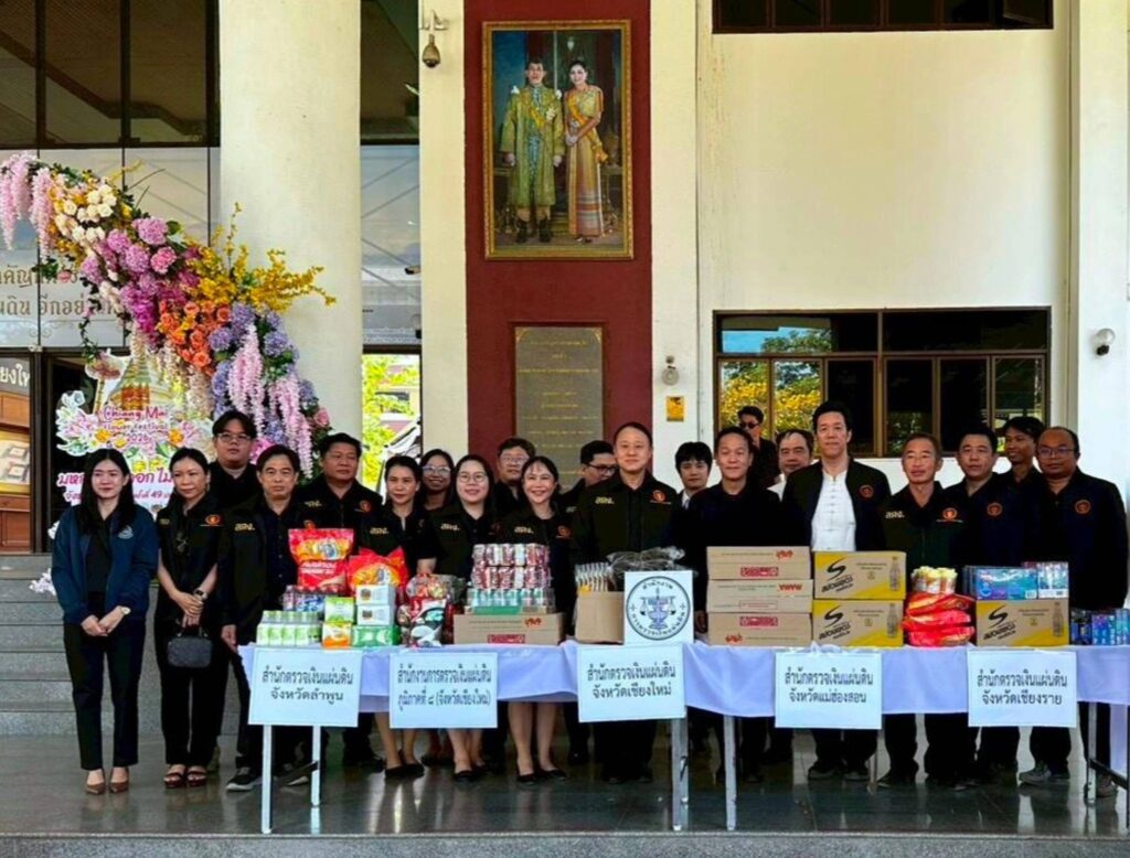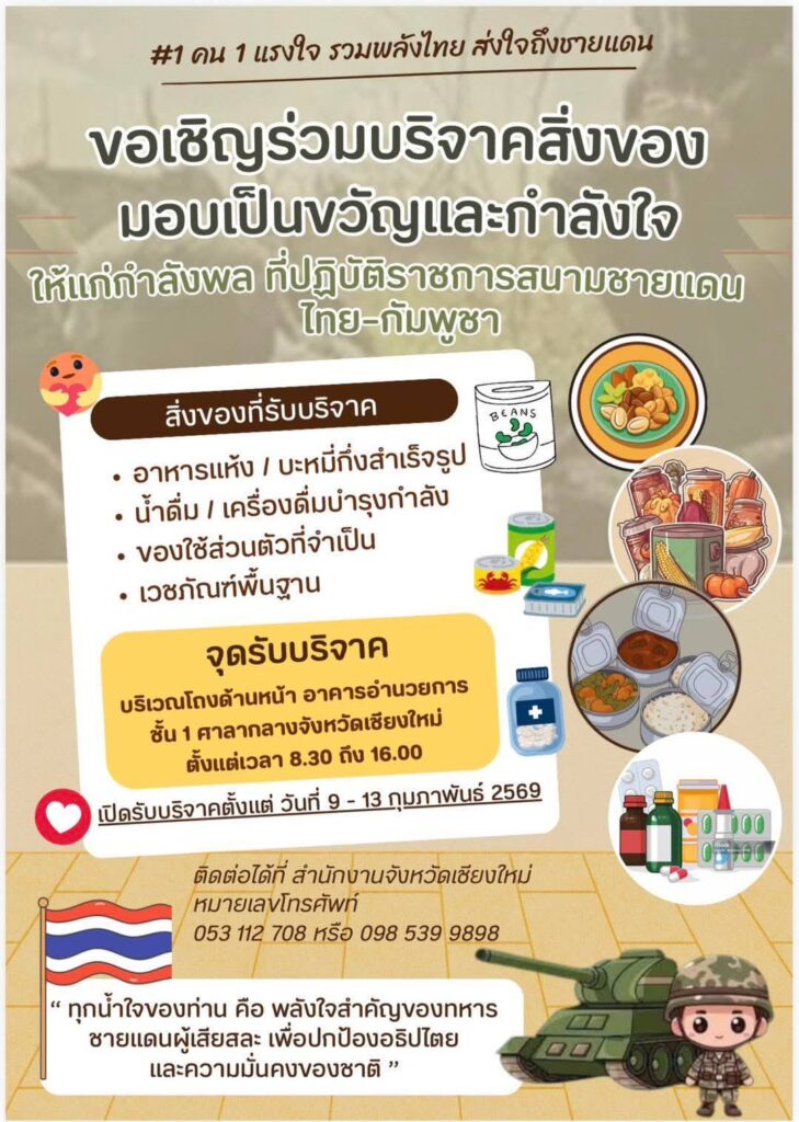 ๑๓ กุมภาพันธ์ ๒๕๖๙ สำนักงานการตรวจเงินแผ่นดินภูมิภาคที่ ๘ (จังหวัดเชียงใหม่) และสำนักตรวจเงินแผ่นดินจังหวัดในเขตพื้นที่กำกับ นำสิ่งของเครื่องใช้ที่จำเป็น ข้าวสาร อาหารแห้ง เครื่องดื่ม และเวชภัณฑ์พื้นฐาน ไปร่วมส่งมอบที่จุดรับบริจาคนำไปมอบให้แก่กำลังพลที่ปฏิบัติราชการสนามชายแดน ไทย – กัมพูชา เพื่อเป็นขวัญและกำลังใจในการปฏิบัติงานในพื้นที่ต่อไป บริเวณโถงด้านหน้า อาคารอำนวยการ ชั้น ๑ ศาลากลางจังหวัดเชียงใหม่